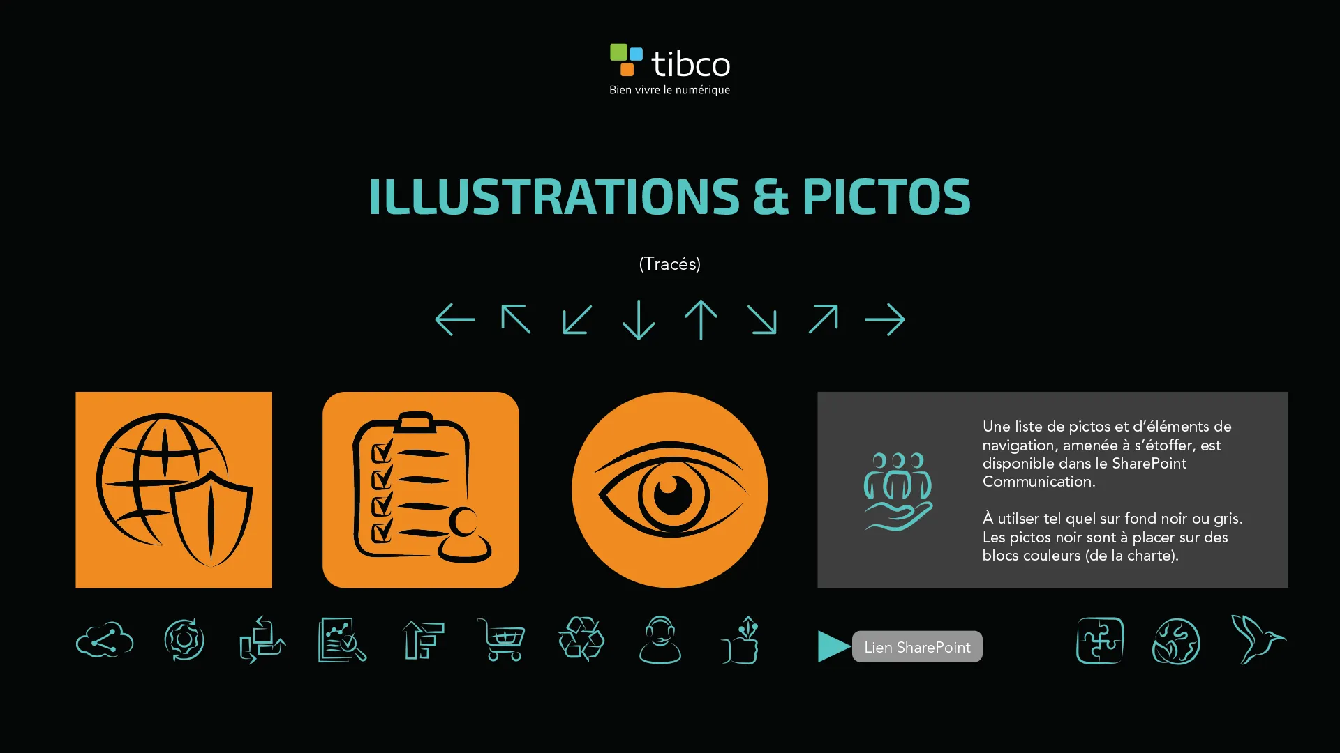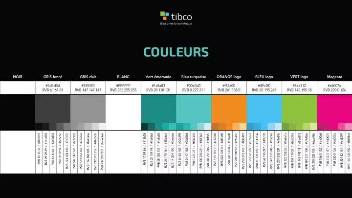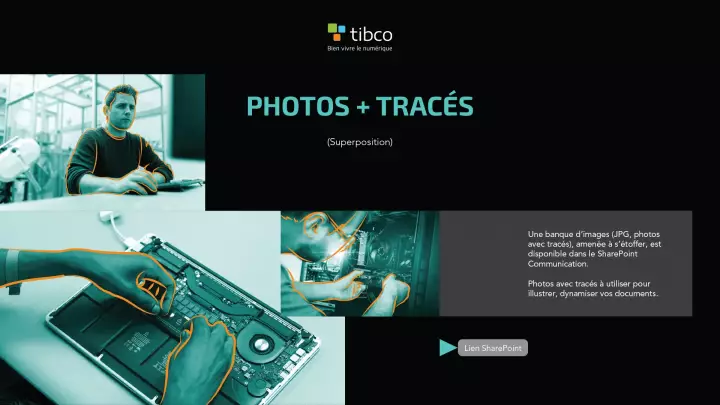 Les personnages dessinés sur fond blanc (charte précédente) laissent place à un univers beaucoup plus techno : fond sombre (noir, gris, ou vert émeraude foncé), texte blanc, photos monochromes sur émeraude avec tracés de contours. Pour l’occasion le logo Tibco bénéficie d’un lifting : abandon des dégradés dans les couleurs pour un résultat plus moderne et lumineux sur fond sombre.